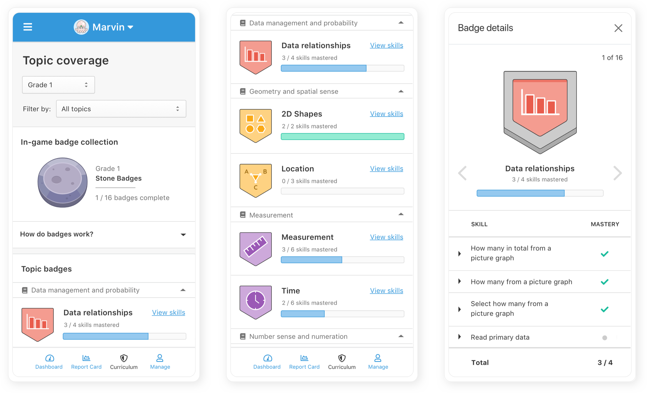 The Curriculum Coverage Report provides parents with insight into their child's educational experience in Prodigy and displays math topics as colourful badges. Parents can see at a glance how their child is advancing through the math curriculum and filter for topics that are completed, in-progress, or not yet started.